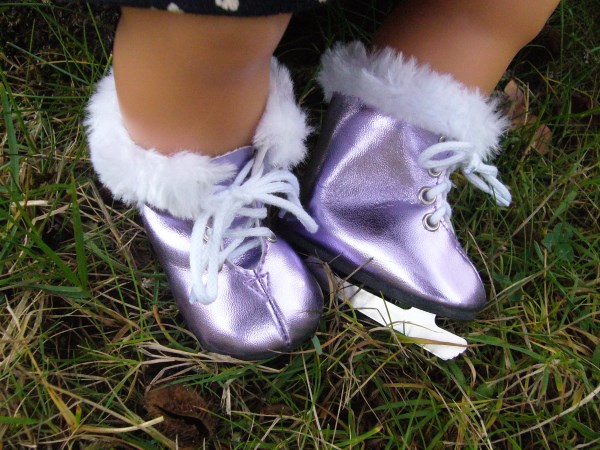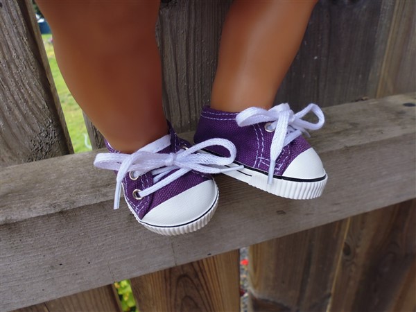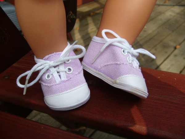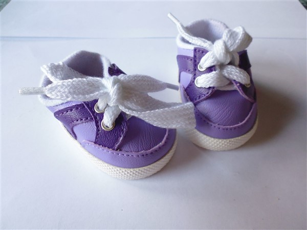 Lila skor som knyts. Skon är 7,2 cm lång och 3,9 cm bred. Passar Skrållan, Baby Born & New Born Baby (43 cm). Pris: 120 kr.