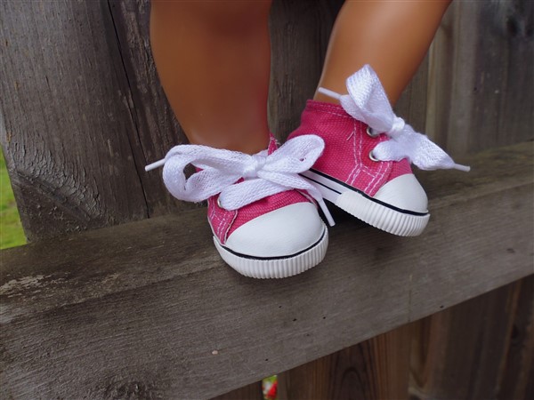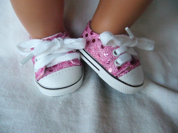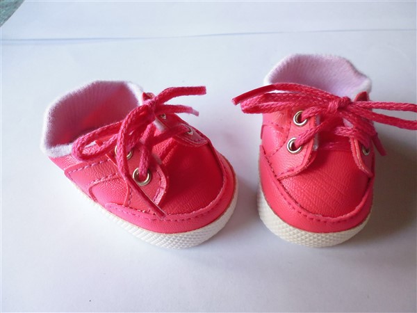 Rosa skor som knyts. Skon är 7,2 cm lång och 3,9 cm bred. Passar Skrållan, Baby Born & New Born Baby (43 cm) Artnr: G-99. Pris: 120 kr.