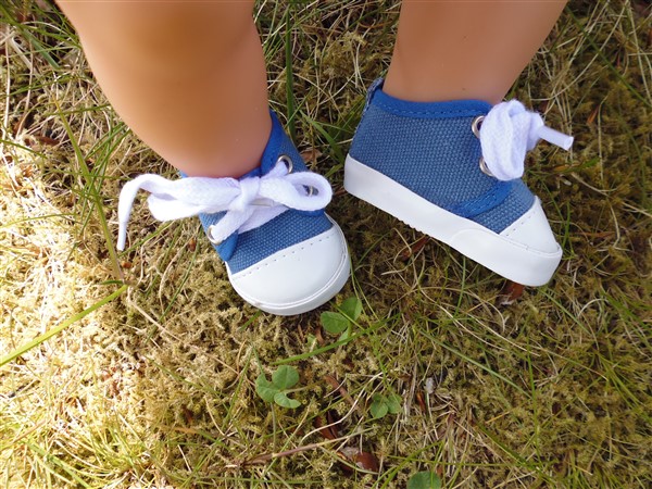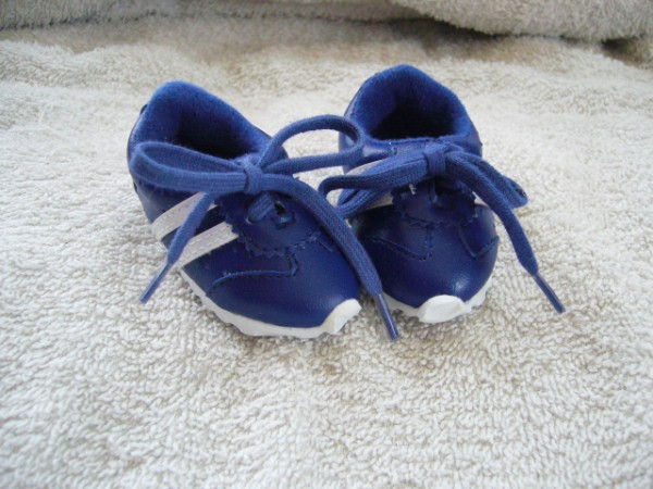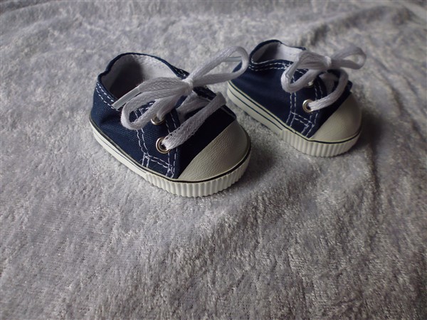 Marinblå & vita tygskor som knyts. Skon är 7,2 cm lång och 3,9 cm bred. Passar Skrållan, Baby Born & New Born Baby (43 cm). Pris: 115 kr.