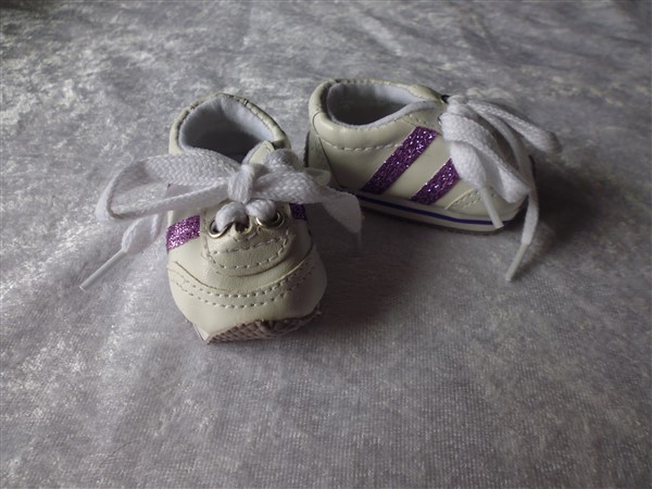 Lila & vita gympaskor. Sulans yttermått är 7 cm. Passar Baby Born & New Born Baby (43 cm). Pris: 115 kr.