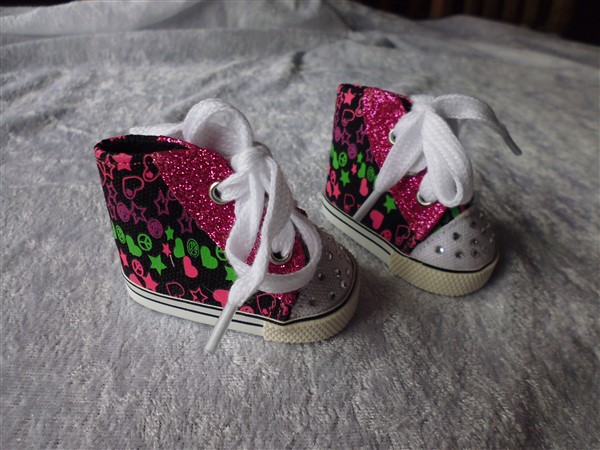 Svarta, cerise & gröna skor som knyts. Sulans yttermått är ca 7 cm lång. Passar Baby Born & New Born Baby (43 cm). Pris: 115 kr.