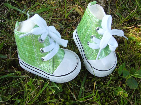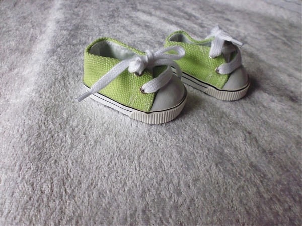 Gröna & vita tygskor som knyts. Skon är 7,2 cm lång och 3,9 cm bred. Passar Skrållan, Baby Born & New Born Baby (43 cm). OBS! Är lite mer gröna än vad bilden visar! Pris 115 kr