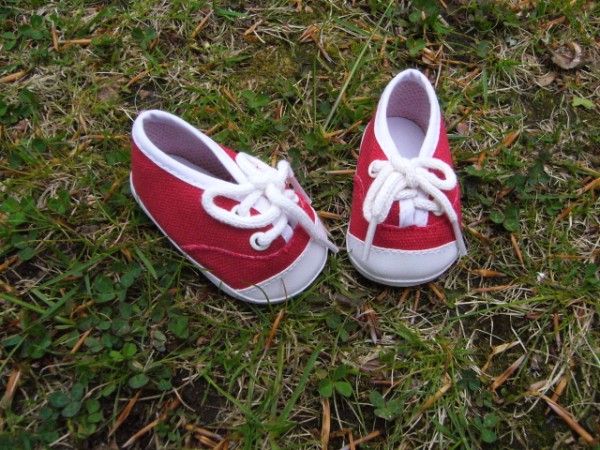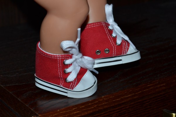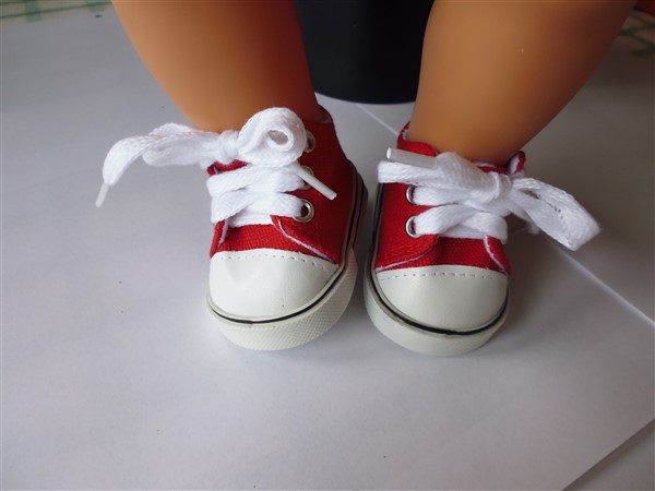 Röda & vita tygskor. Sulans yttermått är ca 7 cm. Passar Baby Born & New Born Baby (43 cm). Pris: 110 kr.