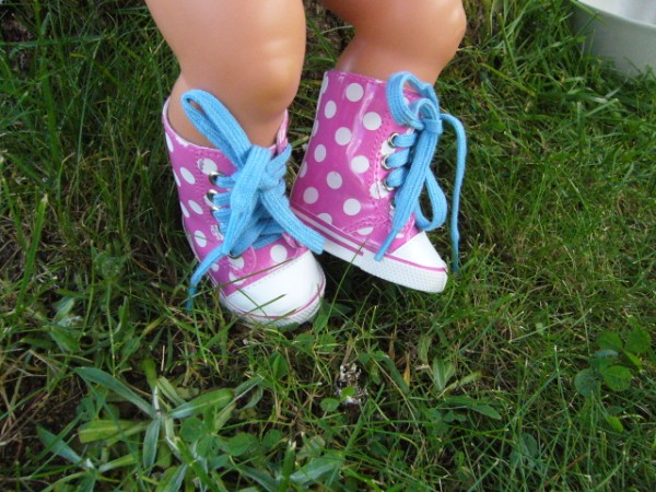 Rosa skor med vita prickar och blått skosnöre. Sulans yttermått är ca 7 cm. Passar Baby Born & New Born Baby (43 cm). Pris: 120 kr.
