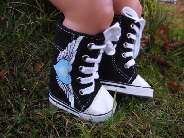 Svarta tygskor med ett ljusblått hjärta och vingar. Sulans yttermått är ca 7 cm. Passar Baby Born & New Born Baby (43 cm). Pris: 120 kr.