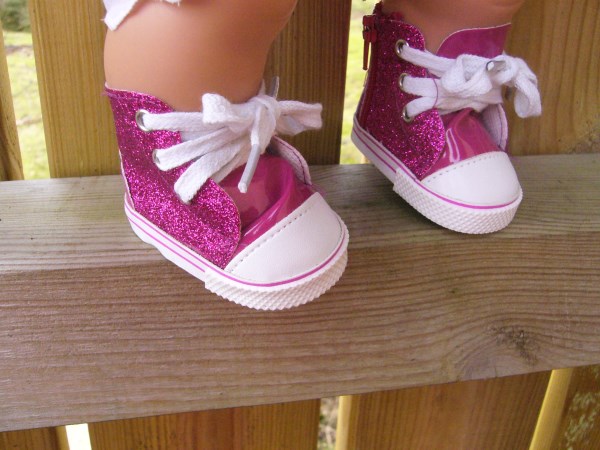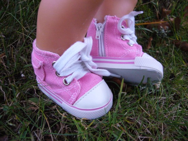 Rosa & vita tygskor med en liten ficka på sidan. De knyts mitt fram, men har även en dragkedja på sidan. Sulans yttermått är ca 7 cm. Passar Baby Born & New Born Baby (43 cm). Pris: 115 kr.