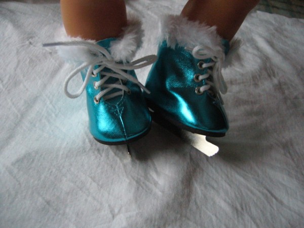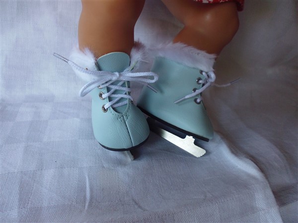 Glänsande turkos skridskor med vit pälskant. Skridskon är ca 7 cm lång. Passar Baby Born & New Born Baby (43 cm). Pris: 149 kr.