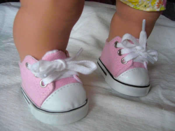 Rosa & vita tygskor som knyts. Skon är 7,2 cm lång och 3,9 cm bred. Passar Skrållan, Baby Born & New Born Baby (43 cm). Pris: 115 kr.