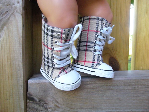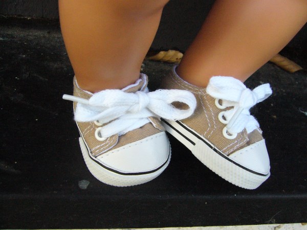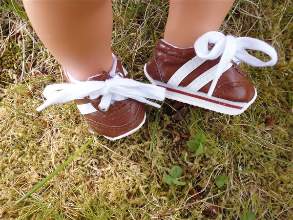 Bruna & vita gympaskor. Sulans yttermått är ca 7 cm. Passar Baby Born & New Born Baby (43 cm). Pris: 110 kr.