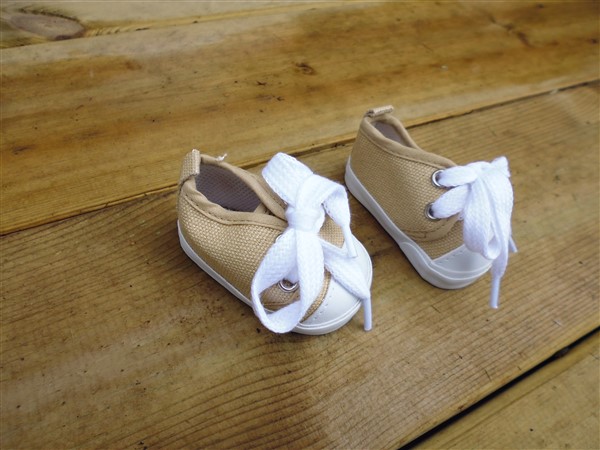 Beige tygskor. Sulans yttermått är ca 7 cm. Passar Baby Born (43 cm) & New Born Baby (43 cm). Pris: 89 kr.