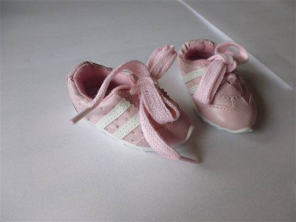 Rosa & vita gympaskor. Sulans yttermått är ca 7 cm. Passar Baby Born (43 cm) & New Born Baby (Simbas 43cm). Pris: 115 kr.