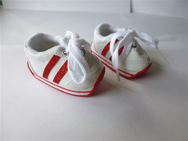 Röda & vita gympaskor. Sulans yttermått är 7 cm. Passar Baby Born & New Born Baby (43 cm). Pris: 115 kr.