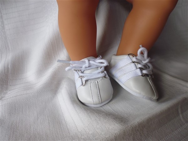 Vita skor som knyts. Sulans yttermått är ca 7 cm lång. Passar Baby Born & New Born Baby (43 cm). Pris: 110 kr.
