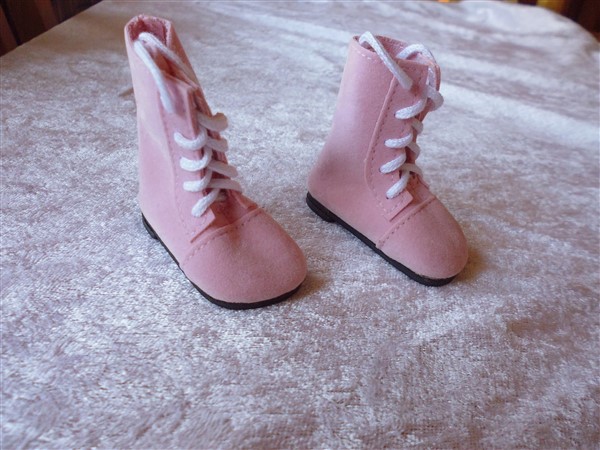 Rosa sammetsliknande stövlar som knyts. Stöveln är 5,4 cm lång, och skaftet är ca 5,5 cm hög utan sulan. Pris: 118 kr
