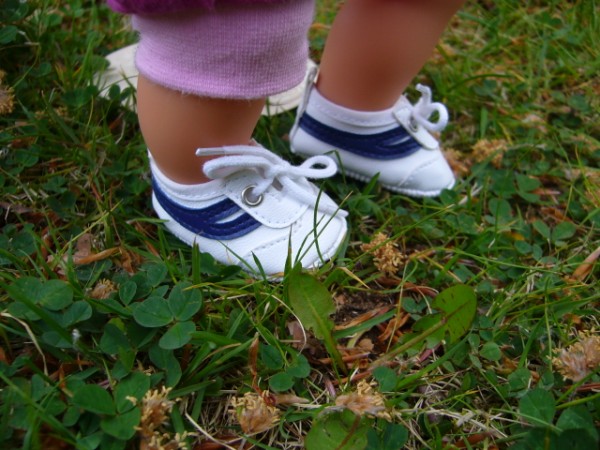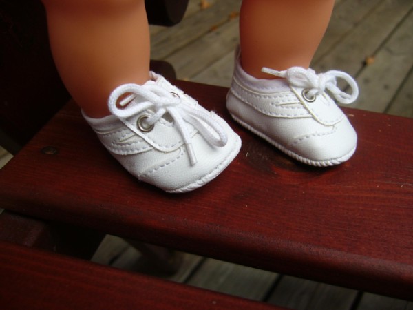 Vita gympaskor. Skon är 5,4 cm lång och 2,5 cm bred. Passar My Little Baby Born (32 cm), baddockan Anna, Lillan & Chou Chou (36 cm). Pris: 115 kr.