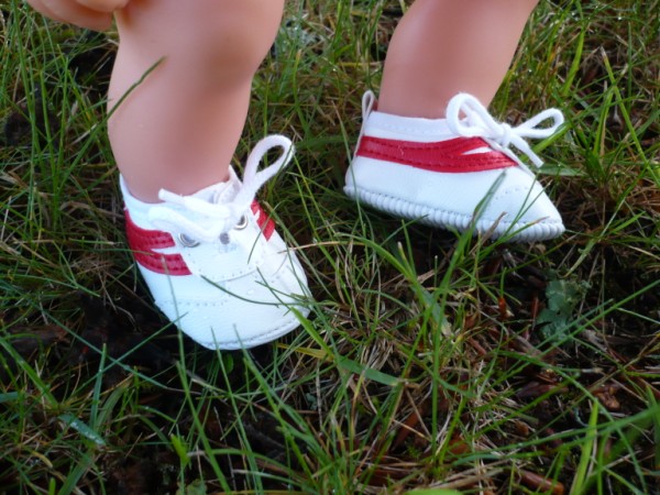 Vit & röda gympaskor. Skon är 5,4 cm lång, och 2,5 cm bred. Passar My Little Baby Born (32 cm), baddockan Anna, Lillan & Chou Chou (36 cm). Pris: 115 kr.